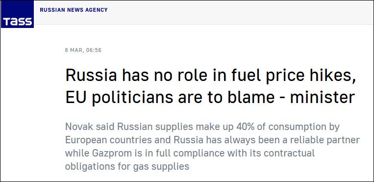 俄副總理:若美歐拒絕俄石油,油價或超每桶300美元針對美國欲聯合歐洲盟友進一步制裁俄羅斯、研究禁止進口俄羅斯石油的可能性問題,俄羅斯副總理諾瓦克(Alexander Novak)3月7日發表電視講話時表示,這將給全球市場帶來災難性後果,或導致油價超過每桶300美元。他還警告稱,針對“北溪2號”受到的制裁,俄羅斯完全有權采取針鋒相對的行動,停止通過“北溪1號”輸送天然氣,但俄方并沒有這樣做。他還強調,俄羅斯與當前國際市場石油天然氣價格飆升沒有任何關係。