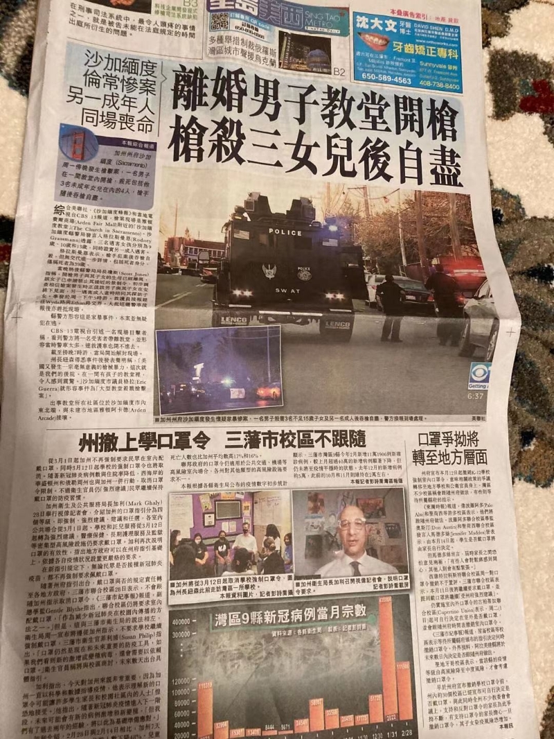 由當日報章報道可知,是否解除口罩令爭拗持續。受訪者供圖 以視頻接受採訪的黃小姐一邊說,一邊透過鏡頭向記者展示她手中拿著的一份當地報紙,她說:“美國許多地方都已經撤銷口罩令,而我居住的三藩市校區並不打算跟隨,現在疫情仍然嚴重,什麽與病毒共存?那是不可能的。”記者從她展示的報紙更可以看出美國在防疫方面,在是否解除口罩令方面爭拗持續,意見不一,各個地方都沒有辦法達至共識。 黃小姐告訴記者,美國現時許多學校都已經陸續恢復面授課,並放寬防疫措施,多個地區的校區也逐漸解除口罩令。“可能是疫情被困的時間太久吧,我看到學生回校上課和放學回家都表現得過度興奮,簡直可以用失控來形容。”黃小姐非常擔心美國的疫情又會反彈。