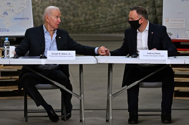 拜登會見波蘭總統杜達 圖自外媒 報道稱,拜登此行由美國國務卿布林肯和美國國際開發署署長薩曼莎·鮑爾陪同。當天早些時候,拜登訪問了駐波美軍,還發推自曝與士兵們分享披薩。 “今天下午,我在波蘭的基地會見(美軍)第82空降師成員”,他發推曬出與士兵們分享披薩的照片。↓