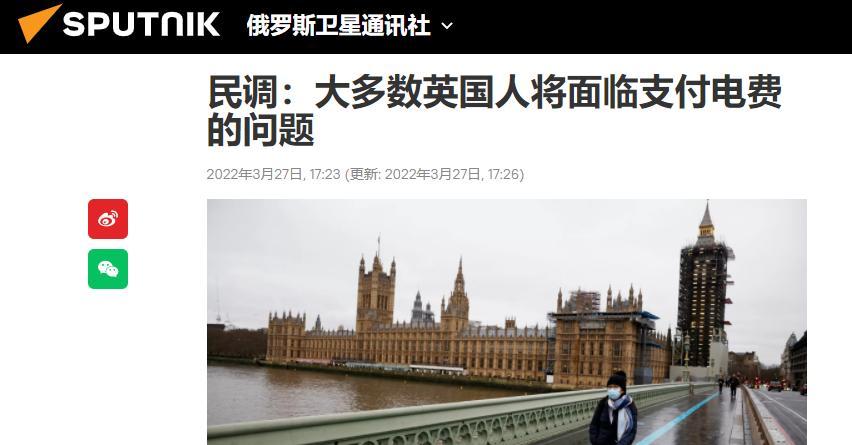 據英國《每日快報》3月26日報道,一項在英國進行的調查顯示,三分之二受訪者稱自己將無法承擔價格飈升的供暖費和電費。此前,英國天空新聞網消息稱,近日西方對俄羅斯的制裁已經開始加劇英國本就嚴重的生活成本危機。俄羅斯媒體也注意到了《每日快報》的這篇報道,“今日俄羅斯”(RT)稱,由於俄羅斯仍是歐洲最大的能源供應國,西方對俄實施的制裁會讓情況進一步惡化。