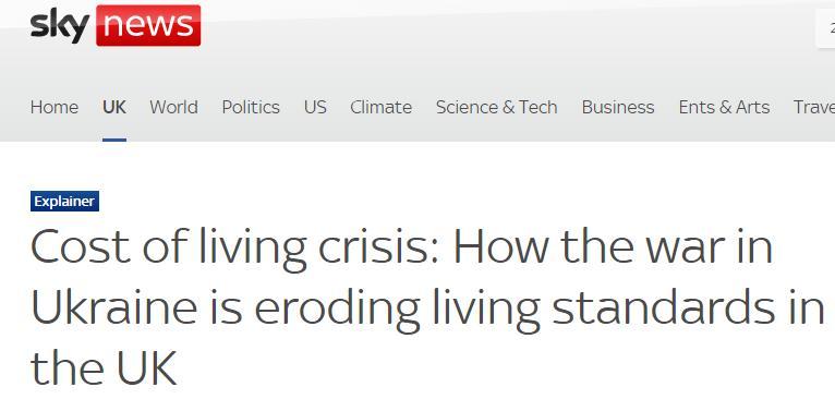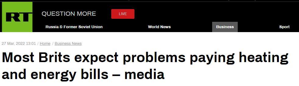 “今日俄羅斯”報道截圖 英國天空新聞網在3月20日的報道中指出,近日西方對俄羅斯的制裁已經開始加劇英國的生活成本危機。儘管英國對俄羅斯進口產品的依賴有限,但全球物價的飈升預計將進一步降低英國人的生活水平。 英國經濟與商業研究中心(CEBR)還稱,今年英國家庭平均收入預計將減少2553英鎊,其中一半是俄烏衝突造成的。