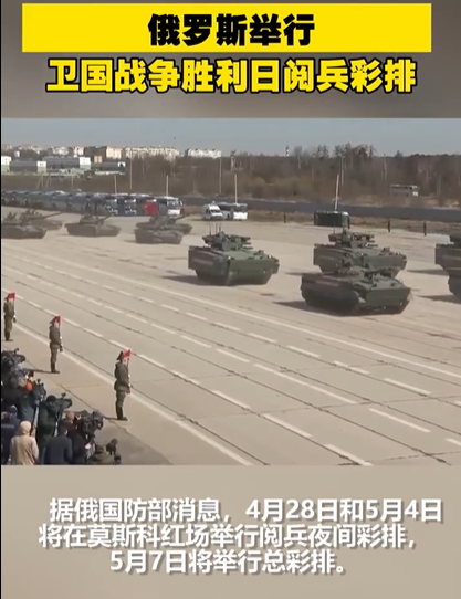 (環視頻截圖) 俄國防部稱,參與閱兵的還有伊爾-76運輸機和號稱“三駕馬車”的圖-160、圖-22M3、圖-95MS俄空軍轟炸機等航空裝備。 5月9日是俄羅斯“衛國戰爭勝利日”。蘇聯於1945年6月24日首次在莫斯科紅場舉行閱兵式。蘇聯解體後,俄羅斯自1995年起每年5月9日舉行勝利日閱兵式。 此前,烏克蘭武裝部隊總參謀部發表聲明,稱俄羅斯軍隊被告知必須在5月9日之前結束在烏克蘭的特別軍事行動,以慶祝“衛國戰爭勝利日”。 俄國防部表示,4月28日和5月4日將在莫斯科紅場舉行夜間演習,5月7日將舉行閱兵總排演。5月9日,在莫斯科紅場舉行紀念偉大衛國戰爭勝利77周年閱兵。 5月9日當天,俄羅斯28個城市將舉行閱兵活動,379個地區將舉行部隊游行。當天晚上10點,俄各城市將鳴放節日禮炮並燃放焰火。(完) 【編輯:李彥洲】