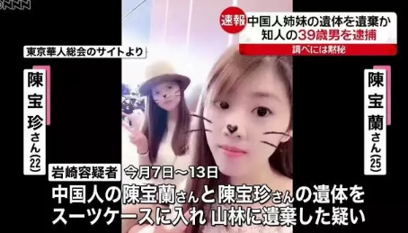 遇害的中國姐妹陳寶蘭、陳寶珍(報道截圖) 一名在姐姐陳寶蘭打工的飲食店的常客具有重大嫌疑。有消息稱,該男子是日本人,30多歲,案發時曾被監控拍攝到出入中國籍姐妹居住的公寓內。另外其駕駛的車輛也在拋屍現場附近出沒。 日本警方以涉嫌非法拘禁罪將其逮捕,在搜集到該男子將遇害姐妹的遺體放在行李箱中并遺棄山林的證據後,21日下午,警方以涉嫌遺棄遺體罪再次逮捕該犯罪嫌疑人。(完) 【編輯:李彥洲】