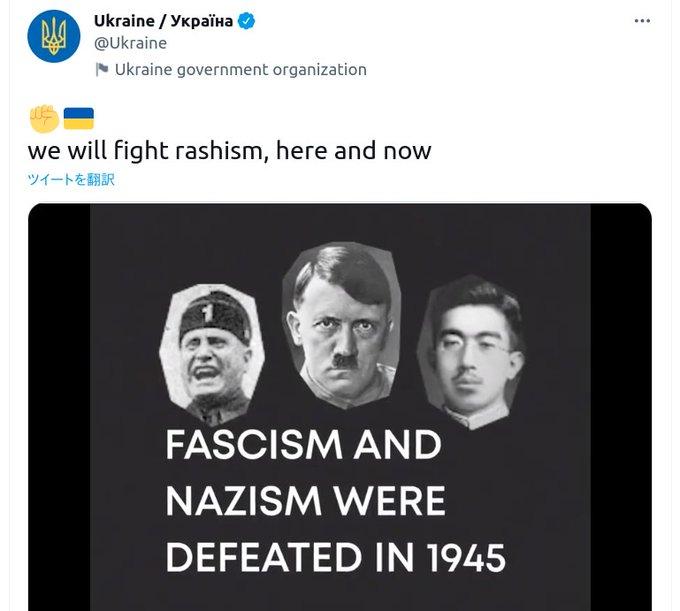 香港中通社4月25日電 據日本共同社報道,烏克蘭政府官方推特賬號在本月1日發布的一段視頻中,有一段打倒法西斯主義的內容出現了日本戰時天皇裕仁、德國前納粹黨領袖希特勒和意大利法西斯領袖墨索里尼三人的合照,引發日本人強烈不滿。