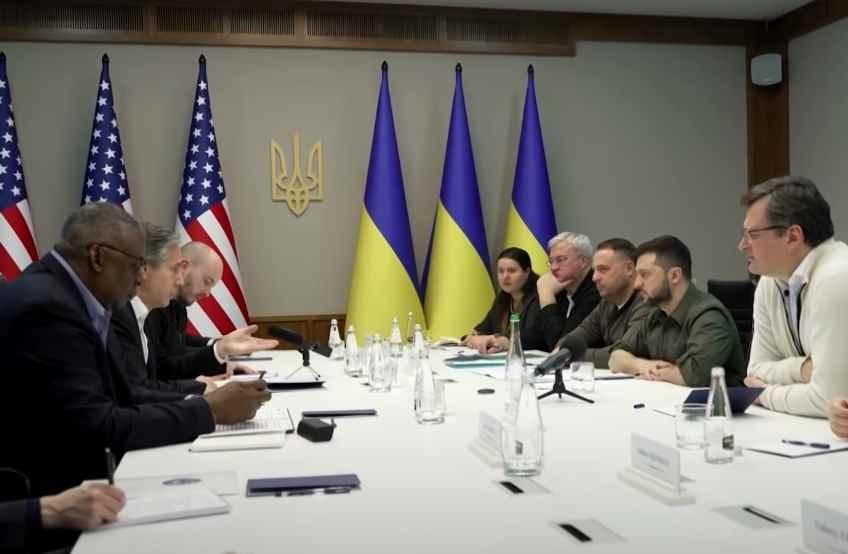 香港中通社4月25日電 當地時間24日晚,烏克蘭總統澤連斯基在基輔會見到訪的美國國務卿布林肯和國防部長奧斯汀。據悉,澤連斯基與美官員就國防援助、加強對俄羅斯的制裁政策、對烏克蘭的財政支持和安全保障進行了討論。