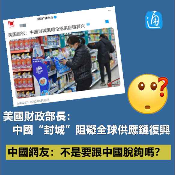 香港新聞網5月20日電 在新冠疫情影響下,全球供應鏈遭遇嚴峻挑戰。5月19日,在與七國集團(G7)財長會面前夕,美國財長珍妮特·耶倫又甩鍋中國,說中國的“封城”措施阻礙商品流動及全球供應鏈復興。 網友留言諷刺道,不是要(與中國)脫鉤嗎?美國怎麽現在又開始講全球供應鏈了?