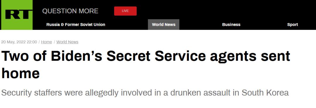 RT報道截圖 報道稱,這兩名特勤5月19日凌晨工作結束後在首爾泡吧,其中一人被指在拜登即將下榻的君悅酒店外襲擊了一名出租車司機。 韓國警方稱,其中一名特勤已被逮捕,但有匿名美國官員稱,他只是“接受了調查”。 RT稱,特勤局發言人古列爾米在一份聲明中回應此事稱,“特勤局已知曉兩名特工在下班後發生的事情,這可能構成潛在的違規行為”,“這倆人將被立即遣返並被安排行政休假,此事對(拜登)即將到來的行程沒有影響”。 RT還援引韓國媒體報道稱,君悅酒店的房客打電話向警方報告了這起爭執,目前只確認這兩人的身份為特工和安全專家,是拜登此訪先遣小組的成員。報道稱,他們是在5月20日拜登抵達韓國之前被遣返回國的。