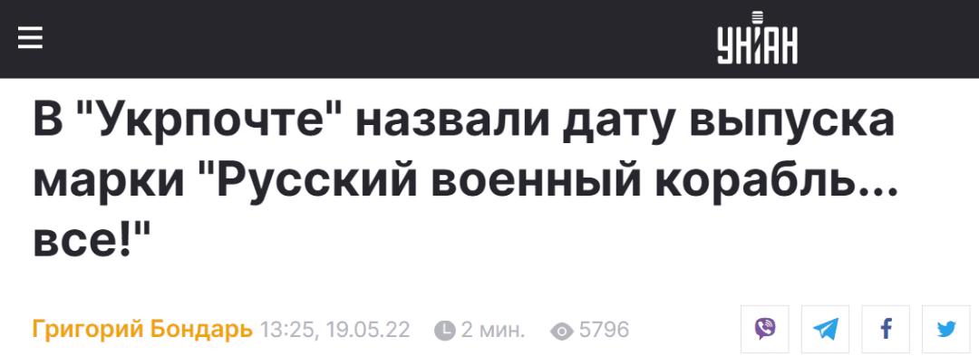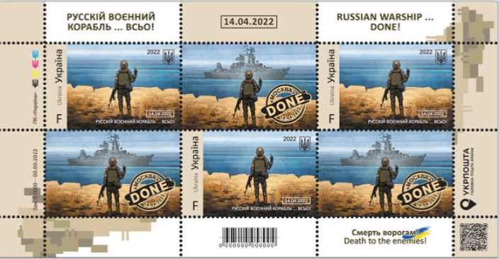 烏克蘭獨立新聞社:烏克蘭郵政公司宣佈“俄羅斯軍艦……完了!”主題郵票發行日期 斯梅里揚斯基在Telegram發文稱,5月23日烏克蘭郵政公司將發布的郵票主題為“俄羅斯軍艦”,發行量為500萬。 郵票有兩個版本——國際版和烏克蘭版,國際版上面寫有“俄羅斯軍艦……完了!榮耀屬於國家”,而烏克蘭版上面寫有“俄羅斯軍艦……完了!消滅敵人!”