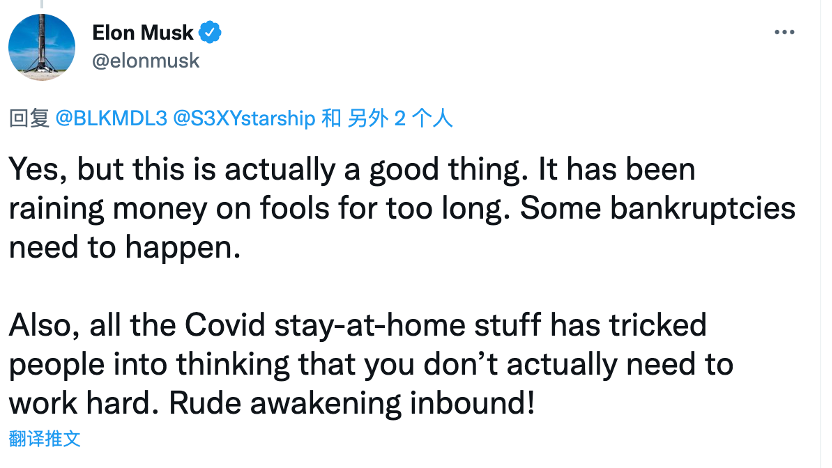 馬斯克推特截圖 隨後,有網友跟進提問馬斯克認為此次經濟衰退將持續多久,馬斯克表示:“根據過去的經驗,大約需要12個到18個月。本質上是負現金流的公司(即價值破壞者)需要消失,以便停止消耗資源。”