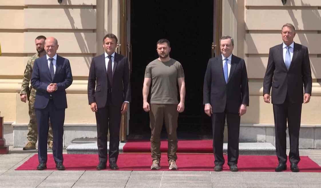 澤連斯基在基輔會晤四國領導人 視頻截圖 澤連斯基當天發表聲明說,他和四國領導人討論了強化烏克蘭國防能力、烏克蘭融入歐洲、加強對俄羅斯制裁等問題。澤連斯基當日在社交平台上配發多張圖片,並稱“我們感謝你們與我們的國家和人民團結一致”。 朔爾茨發推特稱,澤連斯基接受他的邀請,將線上參加G7峰會。德國是目前七國集團的輪值主席國,本年度的G7峰會將於6月26日至28日在德國巴伐利亞州埃爾茂舉行。 這是俄烏衝突以來,法國等四國領導人首次對基輔進行訪問。16日上午,德法意三國領導人前往被戰爭摧毀的基輔郊區伊爾平地區。法新社報道稱,他們在這裡承諾要幫助烏克蘭打敗俄羅斯,重建被摧毀的城市。馬克龍說:“我們堅定地與烏克蘭人站在一起,烏克蘭必須取得勝利。” 一名法國外交消息人士對隨團記者說,這種勝利應該包括收回“被俄羅斯吞併”的克里米亞。 《紐約時報》評論稱,此次訪問正值歐洲對烏克蘭的支持引發質疑之際,澤連斯基不斷呼籲歐洲給烏克蘭提供更多重型武器,但法德等國的態度令烏不滿。數次批評德國政要的烏克蘭駐德大使梅爾尼克將此訪形容為“重要信號”。他16日對德媒說,這應該開啟德國支持烏克蘭的新篇章,烏克蘭人希望(德)總理不是空手而去。他還列出一系列重武器需求清單。(完) 【編輯:李雪萍】