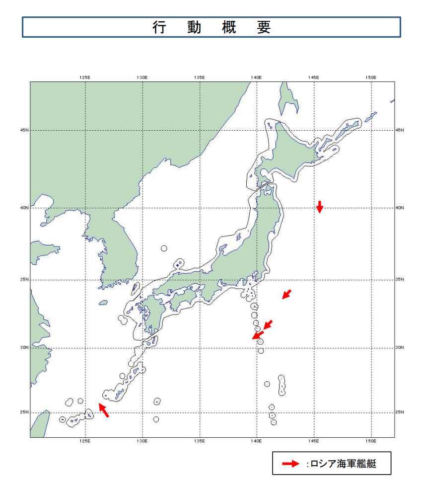 俄羅斯軍艦的航行路線 圖源:日本防衛省 日本防衛省統合幕僚監部19日發佈消息稱,這5艘俄羅斯軍艦於15日抵達北海道襟裳岬東南約280公里處海域,16日9時左右航行至千葉縣犬吠埼東南約180公里處海域,16日19時左右和17日午夜左右出現在伊豆群島中須美壽島與鳥島之間海域,並在19日16時左右通過沖繩島和宮古島之間的海域駛向東海。 日本海上自衛隊19日下午發現5艘俄軍艦艇向西北方穿越宮古海峽,包括3艘護衛艦、1艘驅逐艦及1艘導彈觀測支援艦。日本海上自衛隊繼續派出艦艇及飛機,海空兩路對俄軍艦艇收集情報及警戒監視。 NHK報道稱,這些俄羅斯軍艦的航行路線相當於繞行日本近半圈。 NHK引述日防衛省消息人士的話說,俄國防部稱本月在太平洋舉行包括40多艘軍艦和艦隊支援艦的大規模演習,這5艘軍艦據信參加了此次演習。目前,日本防衛省正試圖確定俄軍艦此次航行的目的。日方將保持警惕,並繼續進行監視。(完) 【編輯:胡雪石】