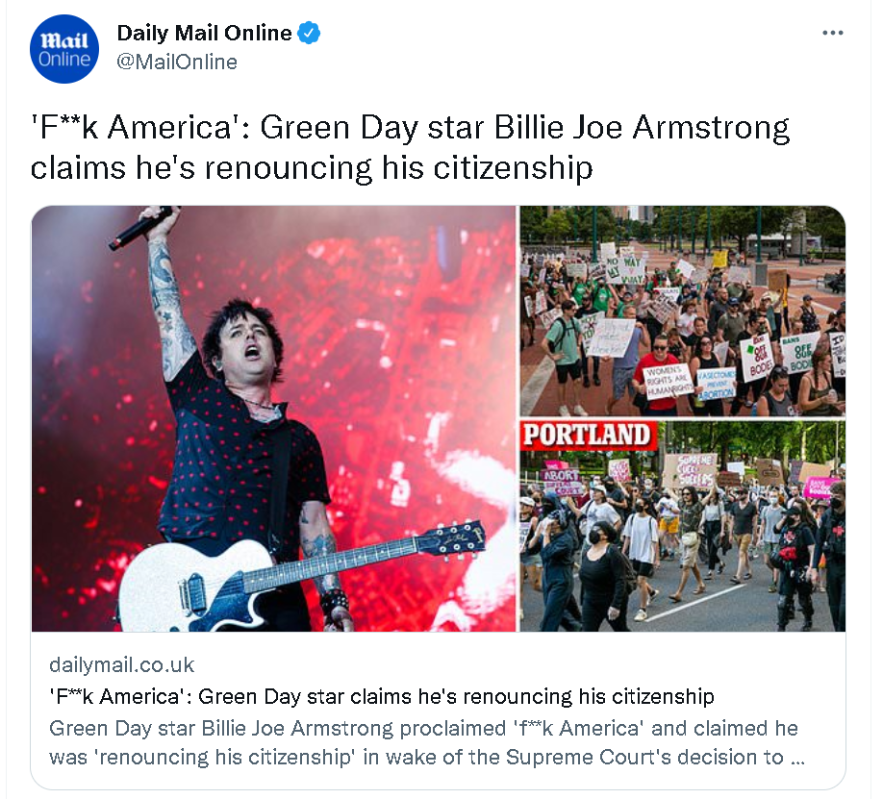 香港新聞網6月27日電 在英國倫敦舉辦演唱會的美國著名朋克樂隊“綠日”(Green Day)的主唱兼吉他手比利·喬·阿姆斯特朗,於美國最高法院做出的廢除憲法對女性墮胎權保護的裁決後宣布,放棄他的美國國籍。事件引發網友熱議。