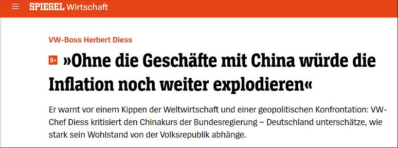 《明鏡周刊》報道截圖 他指出,如果與中國脫鉤,德國的情況“看起來將完全不同”,經濟增長、繁榮和就業機會都會受到影響。 “如果沒有與中國的業務往來,通過膨脹將進一步加劇。因此我們需要更多對話。”迪斯說。 上個月,德國經濟部打著所謂新疆“強迫勞動”和“大規模拘禁”等幌子,決定不為一家德國公司在中國的項目提供擔保。有消息稱,這家公司就是大眾汽車。 大眾汽車隨後證實,該公司已向德國經濟部提交在中國的投資擔保申請,但尚未收到該部的正式決定。“當然,拒絕是一個可能的結果。” 迪斯隨後對此事做出回應,表示大眾將堅持繼續經營在新疆的汽車工廠,並強調“大眾與(中國)上汽集團在新疆的合資工廠有助於改善當地人的處境。” 在接受《明鏡周刊》採訪時,迪斯再度回應了新疆問題,他表示,新疆工廠成立於2012年,有著良好的願景,即“中國政府想讓一個不發達地區工業化。我們想成為其中的一部分”。 “我一直關注著這里(新疆工廠),並派了許多經理過去,以確保那里的一切都井然有序。時至今日,我認為我們應該留在那里,因為撤出的選項沒有任何用處。” 迪斯說。他承認自己還沒有親自去過大眾新疆工廠,但計劃盡早與中國業務負責人布蘭德斯塔特(Ralf Brandstatter)一同前往。 被問及“如何確保人權在工作中不被侵犯”時,迪斯表示:“我每年都會從合資夥伴那里得到幾次關於這方面的信息。最近一次我們就這個問題的交流是在上周。有30%的少數民族在(新疆)工廠工作。我們在那里有法律保障,有祈禱室。我們可以確保那里不存在強迫勞動。”