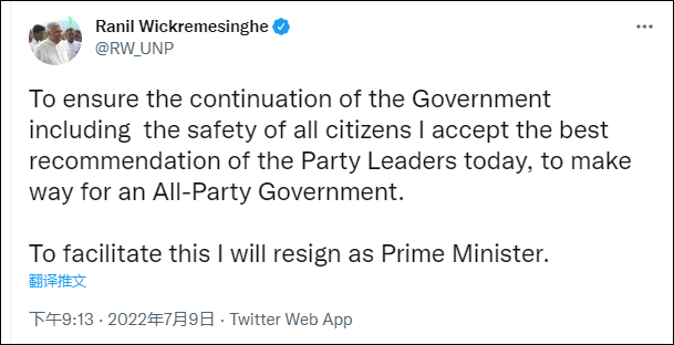 根據總理辦公室的聲明,維克勒馬辛哈做出這一決定,是因為燃料分配將重新開始,國際貨幣基金組織的債務可持續性報告也很快將敲定。 現年73歲的維克勒馬辛哈是第五次出任斯里蘭卡總理一職,這一次他在上台短短兩個月後宣布將辭職。 7月9日晚,據當地媒體報道,斯里蘭卡總統拉賈帕克薩也已通知議長阿貝瓦德納,他將於7月13日辭去總統職務。 國家破產危機延續 早在去年,斯里蘭卡的經濟危機就已初現苗頭,2021年9月,斯里蘭卡總統戈塔巴雅·拉賈帕克薩宣布該國進入“經濟緊急狀態”,該國陷入陷入經濟的寒冬。 據美聯社報道,斯里蘭卡的外債總額達到510億美元,2026年以前需支付250億美元,另有70億美元需今年支付。但目前,極度缺錢斯里蘭卡已暫停償還外債。 7月5日,斯里蘭卡正式宣布破產。由於外匯儲備消耗殆盡、商品進口無法得到保證,這個2200萬人口的印度洋島國正處於該國歷史上最嚴重的經濟危機的陣痛之中。 斯里蘭卡6月的通貨膨脹飆升至54.6%,食品價格飆升80%。預計未來幾個月還可能進一步上升至70%,國內已連續多個月面對燃料和醫藥品等必需品短缺的問題。 苦於糧食儲備不足,6月17日,斯里蘭卡政府下令讓除了醫療等重要服務崗位的工作人員外,所有人都居家辦公,以節省燃料、有時間種植自家水果和蔬菜。 6月27日起,斯里蘭卡暫停向普通民眾出售燃油,只允許為醫療衛生、火車、公共汽車以及運輸食品的車輛等基本服務提供燃料,以應對燃料嚴重短缺的局面。 7月3日,因沒有足夠的燃料讓老師和家長把孩子送到教室,斯里蘭卡將學校的停課時間延長了一周。 斯里蘭卡對IMF的援助寄予厚望。此前(6月22日),維克勒馬辛哈曾表示,國際貨幣基金組織的紓困是避免斯里蘭卡發生經濟災難的唯一選擇。斯里蘭卡政府正在與國際貨幣基金組織(IMF)舉行談判,希望尋求30億美元的紓困資金。政府也正在與外國債權人談判,尋求債務重組。但維克勒馬辛哈5日稱,與國際貨幣基金組織的談判是“困難的”,因為他們作為“破產”國家而不是發展中國家進行討論。 中國駐斯里蘭卡大使館9日發布消息,提醒在斯中國公民加強安全防範。中國駐斯里蘭卡大使館提醒在斯中國公民密切關注當地安全形勢;切勿參與、圍觀任何抗議活動;遵守當地法律法規,提高警惕,註意安全,加強防範,減少外出;保持通信順暢,及時關註使館通知提醒。如遇緊急情況,請及時報警並與中國駐斯里蘭卡大使館聯系尋求協助。 【編輯:丘志彬】