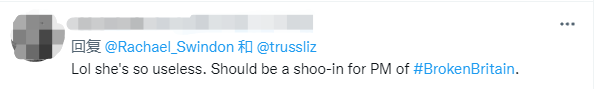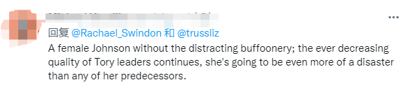 有網友稱特拉斯為“女版約翰遜”,認為“保守黨黨首的素質每況愈下,她將比她的任何前任都糟糕!”
