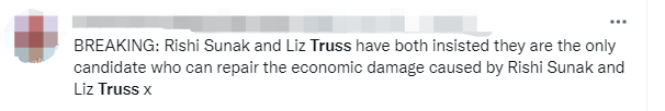 有網友神評論道:“重大新聞:蘇納克和特拉斯都堅信他們是唯一可以重振經濟的候選人,但經濟下滑就是他們在政府就職時造成的。”