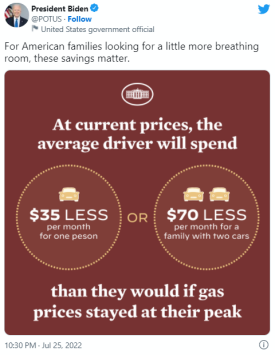 香港新聞網7月26日電 據美國福克斯新聞網報道,如今美國的平均汽油價格幾乎是拜登就任總統時的兩倍,然而,他卻在當地時間25日發佈的推特上吹噓自己讓油價從最高峰時期有了小幅下跌,這在社交媒體上引起民眾對他又一次嘲諷。而且有用戶發現,拜登的這一推文配圖中還有錯別字。
