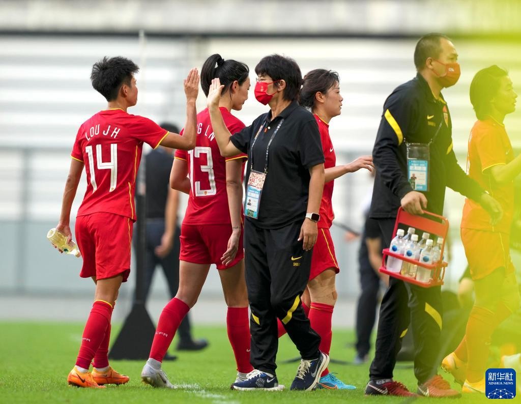7月20日,主教練水慶霞(左三)賽後與隊員擊掌致意。圖源:新華社