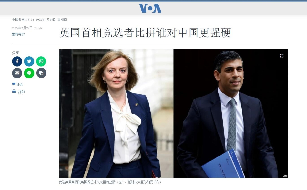 美國X音的這篇文章注意到,在最近的電視辯論中,兩名角逐英國首相寶座的候選人——前財政大臣蘇納克和外交大臣特拉斯,都公開承諾對中國采取更強硬的立場。 特拉斯表示,如果成為首相,她將打擊像抖音海外版TikTok這樣的中資企業,還要限制對中國出口的技術總量。她還提到了新疆、香港。 而她的競爭對手蘇納克則稱中國是英國和全球安全的“頭號威脅”。蘇納克說:“成為首相後,我將采取非常、非常堅定的觀點,確保我們確實捍衛我們的價值觀,保護自己免受這些威脅。” 對於這一“奇特”現象,倫敦大學亞非學院中國研究所所長曾銳生認為,這是因為“保守黨成員比整個英國公眾更關心中國政策”。他解釋稱:“英國首相的實際政策很難與曾經的競選口號相匹配。”但即便如此,他也忍不住批評,“他們只關注‘誰對中國更軟弱’,而不是英國的中國戰略應該是什麼。” 要說接地氣,還得是英國本土媒體。對於蘇納克和特拉斯比拼對華強硬,英國“城市早上”新聞網直接拿克林頓競選口號“笨蛋,問題在經濟!”來嘲諷:“美國前總統克林頓在競選中打出這一口號已有30年了,但它至今仍提醒每一位候選人推動選民把選票投給誰的決定因素是什麼。在今天的英國,老百姓的焦點是能源價格、通脹水平、稅收賬單以及面臨的生活成本危機。” 甚至中國外交部發言人趙立堅也奉勸:“動輒拿中國說事,鼓噪所謂‘中國威脅論’等不負責任的言論,并不能解決自己的問題。” 但美國X音顯然沒有接不接地氣的“思想包袱”,而是繼續發揚“優良傳統”,在文章結尾處加插了一段美國聯邦調查局(FBI)和英國軍情五處(MI5)聯合發出的“警告”,稱“中國構成了‘巨大的共同挑戰’”。 對此,有中國網友直呼:“英國太可悲了。”“不蹭中國的流量,似乎就不知道該怎麼競選了?這正在成為美西方政客的一種病,而英國上演的則是這種病的重症版本。”