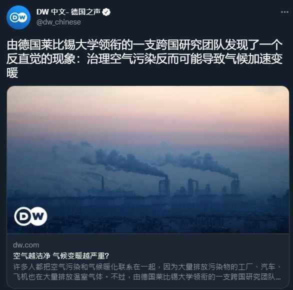 給德國燒煤找台階?德媒:治理空污可能加劇氣候變暖香港新聞網7月28日電 在德國宣佈重啟煤炭發電的背景下,有德國媒體發表了一篇題為“空氣越潔淨,氣候變暖越嚴重”的報道,報道內容是:德國萊比錫大學領銜的研究團隊發現,治理空氣污染反而導致氣候加劇變暖…… 這也讓很多人看得一頭霧水。