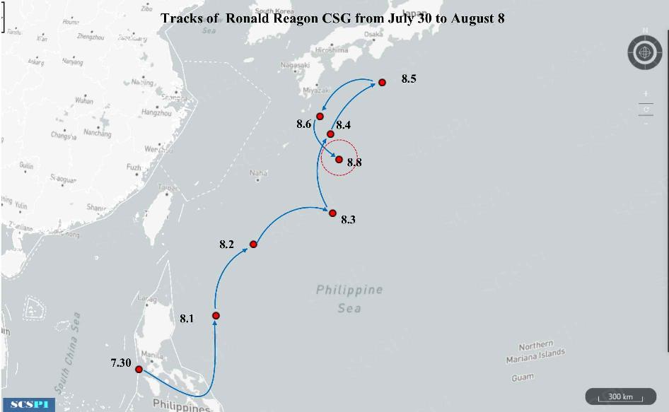 香港中通社8月8日電 南海戰略態勢感知微博消息,8月8日,根據“里根”號航母艦載機“灰狗”C-2A的飛行軌跡判斷,“里根”航母打擊群繼續向南部行駛。與6日的位置相比,至8日中午,該航母向南移動了約140海里。