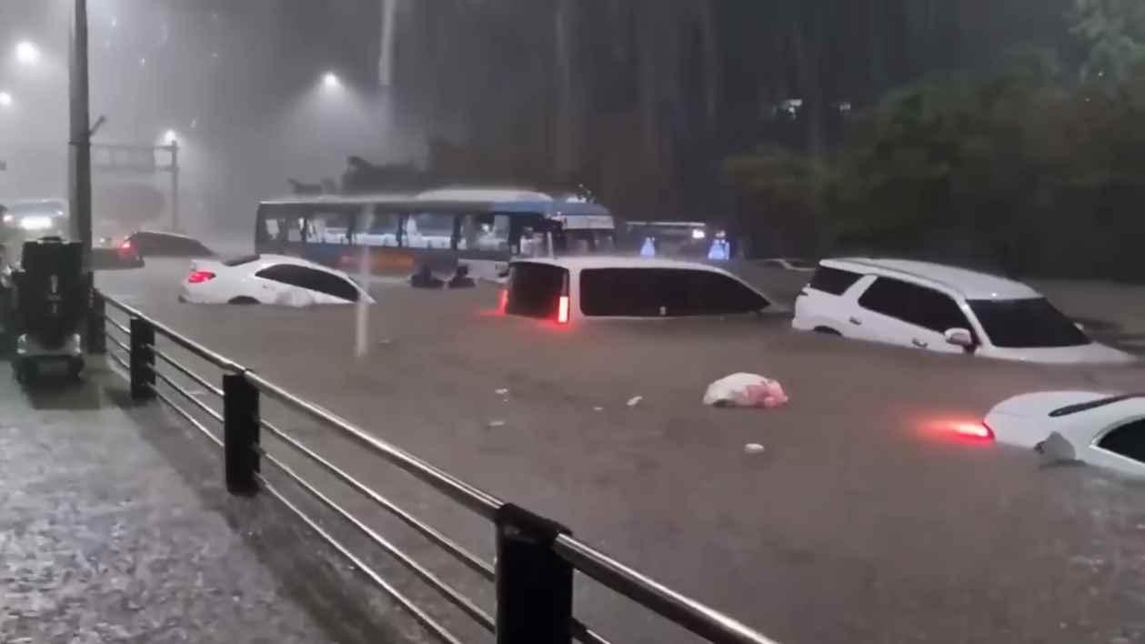 視頻截圖 其中,首爾市有3人因住宅進水被困而死亡,1人因在雨中工作觸電死亡;京畿道1人因公交車站坍塌死亡,1人因道路附近發生泥石流死亡。另外由於地下通道被淹、河水上漲被急流捲走等原因共有6人失蹤。首爾、仁川、京畿地區共有436人因住宅受損,只能暫時安置在學校、體育館、居民中心等地。 此外,首爾有7條地鐵線路進水,仁川有1條地鐵線路進水,造成部分地區停運。還有80處道路、3處地下車道、26處江邊停車場、45處河川旁道路等也被封鎖。 據韓國氣象部門的監測,從8日0時到9日凌晨4時,首爾部分地區累計降雨量達到417毫米,還有多個地區降雨超過300毫米。 《朝鮮日報》稱,當日降雨量為102年以來首爾單日降雨量最高值。 8日23時,韓國國務總理韓德洙主持召開緊急會議,聽取關於暴雨受災情況的匯報,並指示有關部門盡全力開展災後救援工作,保護民眾生命安全。9日凌晨,韓國行政安全部將災害危機警報從“警戒級”上調至“嚴重級”。(完) 【編輯:李雪萍】