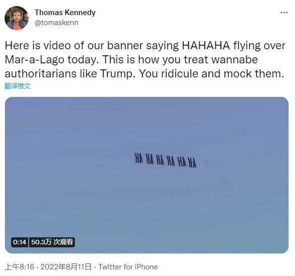 圖片來源:社交媒體推特截圖 此次活動的策劃者托馬斯·肯尼迪接受采訪時表示,他和一群朋友籌集了1800美元,讓一架小飛機掛著橫幅在海湖莊園的上空飛行了超過3個小時,橫幅上寫著“哈哈哈哈哈哈”(HAHAHAHAHAHA),信息是給特朗普及其支持者看的。他稱“嘲弄這位美國前總統讓他感到很愉快”。 8月8日,FBI人員突擊搜查特朗普在佛羅里達州棕櫚灘的住所海湖莊園。美媒稱,這項搜查與特朗普2021年初卸任美國總統時,將一些機密文件帶到海湖莊園有關。特朗普當天對媒體證實,其海湖莊園被一大群FBI特工“包圍、突襲並佔領”,甚至連保險箱也被撬開。 據報道,海湖莊園8日被FBI突擊搜查後,許多特朗普的支持者來到莊園附近集會。(完) 【編輯:李彥洲】