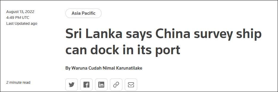 印度反對無效?外媒:斯里蘭卡批準中國測量船靠港綜合路透社、法新社8月14日消息,中國遠望5號測量船已獲批停靠斯里蘭卡南部的漢班托塔港,時間是8月16日至22日。此前有外媒稱,在印度巨大壓力下,斯里蘭卡曾要求中方測量船推遲原定於11日的靠港計劃。