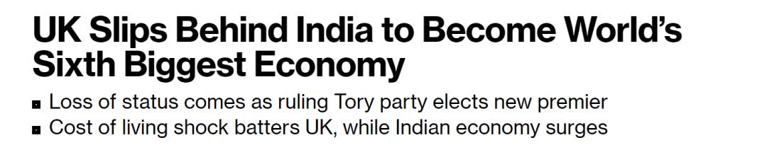 據美國彭博社9月2日報道,最新數據顯示,印度已經超過英國,成為了世界第五大經濟體,這對於處於困境中的英國政府而言無疑是一個新的打擊。 美媒稱,根據國際貨幣基金組織(IMF)發布的各國GDP數據,作為英國前殖民地的印度,在2021年的最後三個月成功超過了英國,成為全球第五大經濟體,而印度的領先優勢在2022年的頭三個月中進一步擴大。