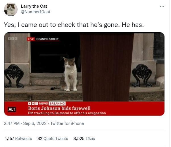 英國“第一貓”拉里現身約翰遜告別演說現場。拉里官方賬號截圖。 隨後,拉里的官方社交賬號配圖發文稱:”是的,我出來確認一下他走了沒有,他走了。” 不久前,拉里的賬號還發文稱,“拜拜約翰遜”。 7月,當約翰遜深陷執政醜聞時,拉里的官方賬號就連發數條推特,喊話約翰遜:“憑良心講,我無法再和首相一起生活了。要麼他走,要麼我走。” 據介紹,拉里在2011年被英國政府委任為“首席捕鼠官”,並入住首相府,牠已在首相府工作11年。(完) 【編輯:關秀英】