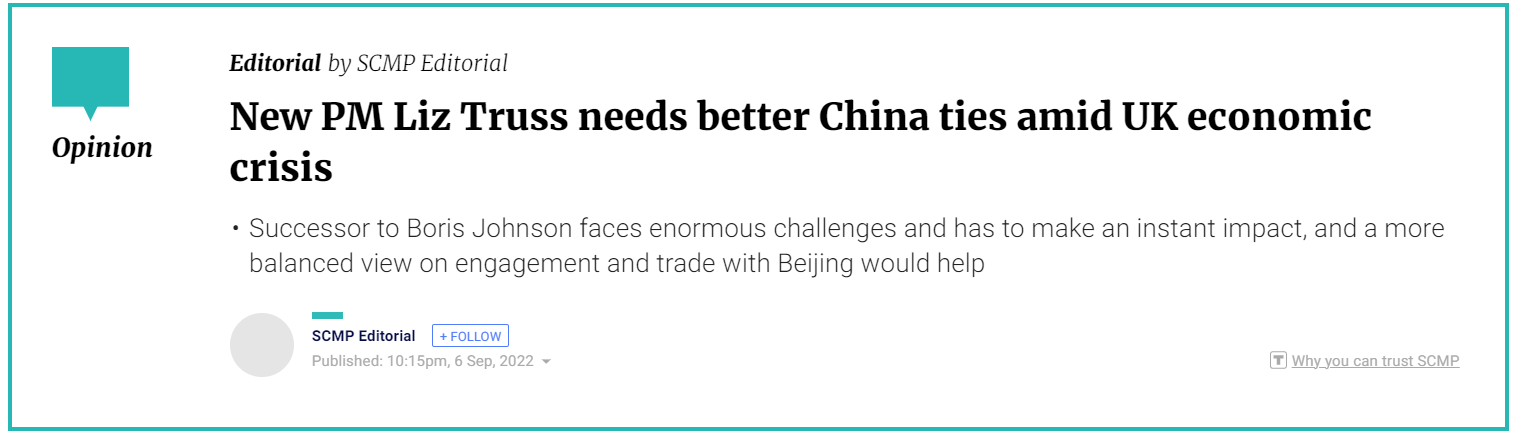 香港新聞網9月8日電 香港《南華早報》近日發表題為《新首相伊麗莎白·特拉斯應在英國經濟危機中與中國保持更好的關係》的社論,呼籲特拉斯認清英國國內面臨巨大經濟危機的事實,不要繼續操弄政治游戲玩火自焚,而是應緩和與最大貿易夥伴之一的中國的關係。