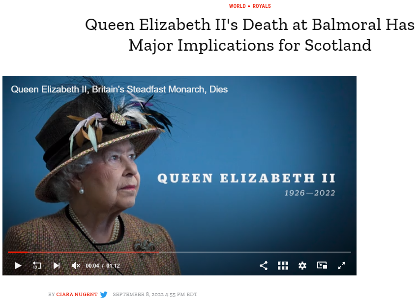 《時代周刊》報道截圖 文章稱,上周四,英國女王伊麗莎白二世在她的蘇格蘭避暑居所巴爾莫勒爾城堡去世,此消息受到了全世界的矚目。伊麗莎白二世是英國歷史上在位最長的君主,享年96歲,近年來一直受到疾病的困擾。白金漢宮發表聲明稱,她的長子查爾斯立即繼位為新國王。