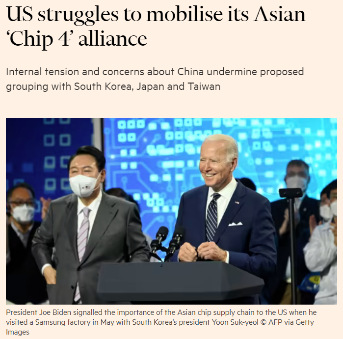 《金融時報》文章截圖 文章稱,美國試圖讓其東亞盟友加入擬議中的半導體供應鏈聯盟的努力受到了阻礙,因為此舉可能會遭到“中國的報複”,或者使地區緊張局勢昇級。 所謂的“芯片四方聯盟”計劃,是美國戰略的一部分,意在貿易和國家安全領域加強其自身對重要芯片的獲取,同時削弱中國的參與度。 該聯盟預計由美國、韓國、日本和台灣地區組成,并將提供一個論壇以討論和協調有關供應鏈安全、勞動力發展、研發和補貼的政策。 然而,在該計劃提出一年以後,四個成員至今仍未確認最終計劃,甚至連初步會議都未提上日程。主要的阻礙因素包括中國可能的反應,將台灣納入政府間論壇的猶豫,以及韓國和日本之間長期的緊張關係。