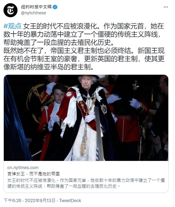 昨日(13日),紐約時報中文網發表了一篇名為《哀悼女王,而不是她的帝國》的文章,開篇就指出,“伊麗莎白二世像所有君主一樣,既是個人,又代表著制度。女王的時代不應被浪漫化。作為國家元首,她在數十年的暴力動蕩中建立了一個僵硬的傳統主義陣線,幫助掩蓋了一段血腥的去殖民化歷史”。 文章稱,“我們可能永遠不會知道,女王對那些以她的名義犯下的罪行知道什麼、不知道什麼,英國君主與英國首相每周會晤的內容仍是不列顛政權中央的一個‘黑箱子’,女王的臣民也不見得瞭解事情的全貌”。 文章認為,“既然她(伊麗莎白二世)不在了,帝國主義君主制也必須終結。”“新國王現在有機會節制王室的豪奢,更新英國的君主制,使其更像斯堪的納維亞半島的君主制,從而產生真正的歷史影響。” 這篇文章的論調顯然刺痛了某些人的神經,以至於該文的評論區直接被謾罵聲所淹沒。值得注意的是,大部分留言用的都是中文,甚至是繁體中文。