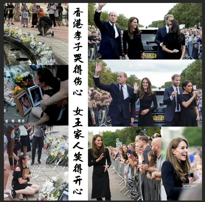 尤其是文中那句“女王的時代不應被浪漫化”,讓人聯想到英女王去世後,香港一些人跑去英國領事館獻花哭喪,其中有人邊哭還邊說:“女王看著我們長大……很傷心很掛念她……她就像我奶奶一樣,聽到消息眼淚自然就流下來。”見此情形,有網友製作了下面這張圖: