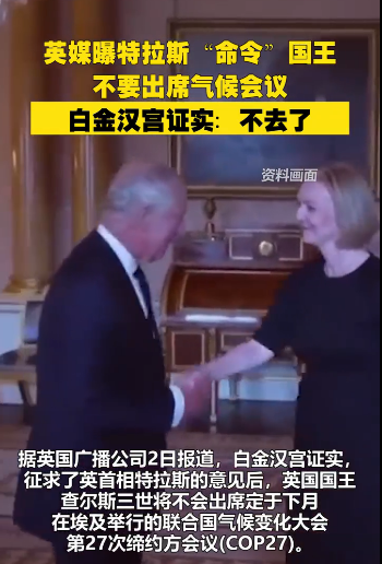 香港新聞網10月3日電 據英國廣播公司2日報道,白金漢宮證實,徵求了英首相特拉斯的意見後,英國國王查爾斯三世將不會出席定於下月在埃及舉行的聯合國氣候變化大會第27次締約方會議(COP27)。BBC稱,就在前一天(1日)英媒《星期日泰晤士報》還曝出,英首相特拉斯“命令”國王不要出席該會議。