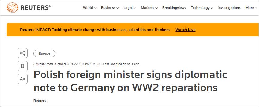 路透社報道截圖 拉烏當天在新聞發佈會上宣佈了此事,稱該照會表明了他的觀點,即雙方應該“立即”採取行動,以“永久且有效的方式”解決德國二戰期間占領波蘭所造成的問題。 波蘭外交部發言人賈西娜(Lukasz Jasina)還透露,拉烏還將在德國外長貝爾伯克10月4日訪問華沙期間當面提及此事。 今年9月1日是納粹德國入侵波蘭83周年。當天,波蘭執政黨法律與公正黨主席卡欽斯基宣讀了一份報告,表示波蘭政府將向德國尋求6.2萬億茲羅提(約合9.08萬億元人民幣、1.32萬億美元)賠償,以彌補二戰期間納粹德國入侵和占領造成的損失。 波蘭總理莫拉維茨基當時也表示,這份報告是“從德國重新獲得賠償的重要一步”,“沒有真相和賠償,波德之間就無法實現真正的和解”。 但在9月1日晚些時候,德國外交部發言人在發給路透社的一封電子郵件中寫道:“德國政府的立場沒有改變,即賠償問題已經結束。” 該發言人稱,波蘭早在1953年就已經放棄了進一步的賠償,並且多次確認了這一點,“這是當今歐洲秩序的基本基礎”。德外交部強調,德國堅持其對第二次世界大戰的政治和道義責任。 【編輯:馬華】