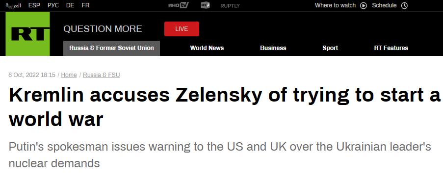 據“今日俄羅斯”(RT)電視臺報道,烏克蘭總統澤連斯基10月6日呼籲北約對俄實施“先發制人打擊”、以阻止後者使用核武器。 該言論引發俄方猛烈抨擊——俄羅斯總統新聞秘書、克宮發言人佩斯科夫指責澤連斯基是在試圖挑起第三次世界大戰,同時呼籲各國關註澤連斯基言論,並特別點出了“美國和英國”。