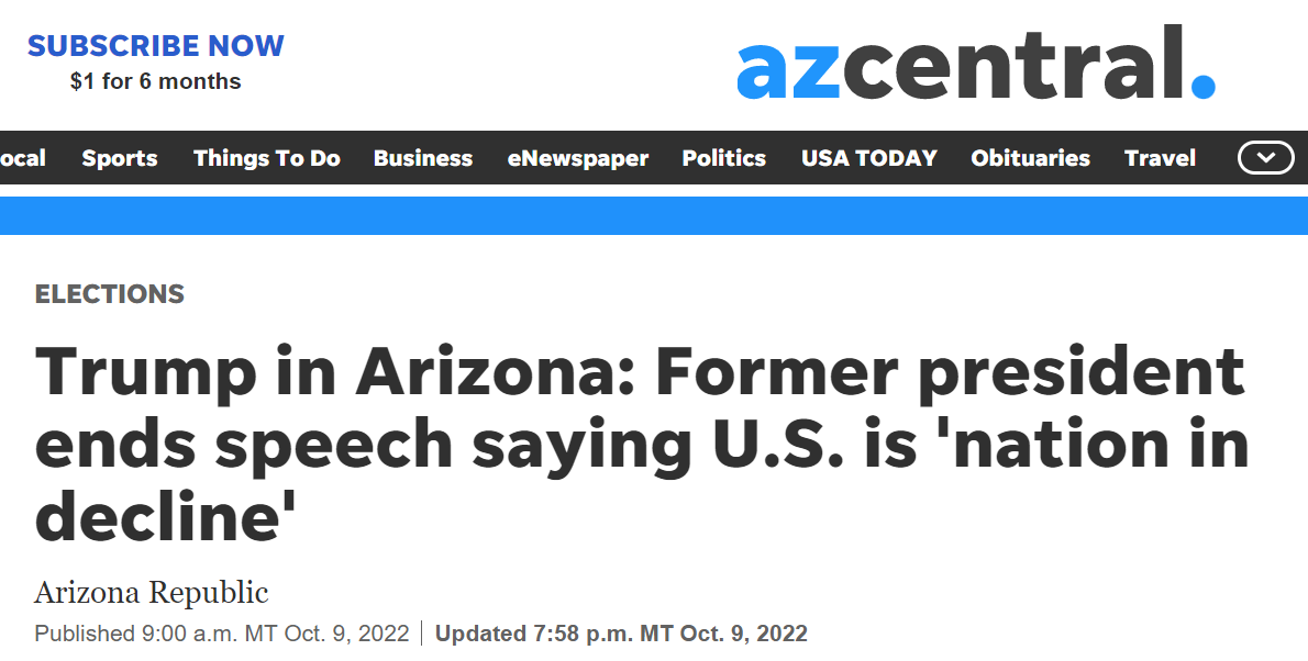 美國《亞利桑那共和報》報道截圖 文章稱,上周日,特朗普現身亞利桑那州的“拯救美國”集會,為州內共和黨候選人在即將到來的中期選舉拉票。 演講期間,特朗普猛批民主黨,稱美國因為民主黨的政策陷入混亂。他還抨擊了美國的通貨膨脹和股市下跌,以及美軍在阿富汗和烏克蘭戰爭中的“犧牲和浪費”。 “我們是一個正在衰落的國家”,特朗普在演講接近尾聲時表示,“我們是一個在很多方面都成為了笑話的國家”。與此同時,集會上正播放著悲傷的音樂。