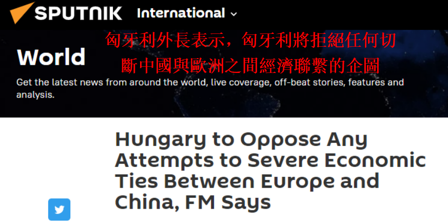 俄羅斯衛星通訊社報道截圖 報道稱,西雅爾多日前在一次能源會議上警告稱,匈牙利將拒絕任何切斷歐盟與北京之間經濟聯繫的企圖。 匈牙利正在敦促歐盟領導層堅持務實的政策。目前歐盟正經受一場經濟危機,包括破紀錄的高通脹,和對俄羅斯實施制裁後所造成的能源危機。