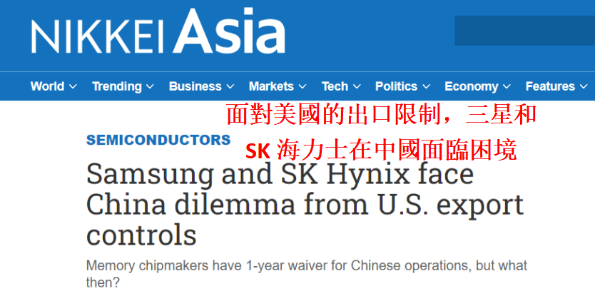 日本《日經新聞》報道截圖 文章稱,兩周前,美國實施了新的對華芯片出口管制,對於運往任何一家中國半導體製造工廠的產品,都需要獲得出口許可證。 韓國企業“三星電子”和“SK海力士”面臨著巨大壓力,儘管美國方面已經給予了這兩家公司為期一年的“豁免”,允許它們繼續在中國使用包含美國技術的半導體設備。 但是在這兩家企業看來,美國方面給予的“豁免”只是給他們一個緩衝期,讓他們做出“調整”,不代表他們未來可以繼續獲利。