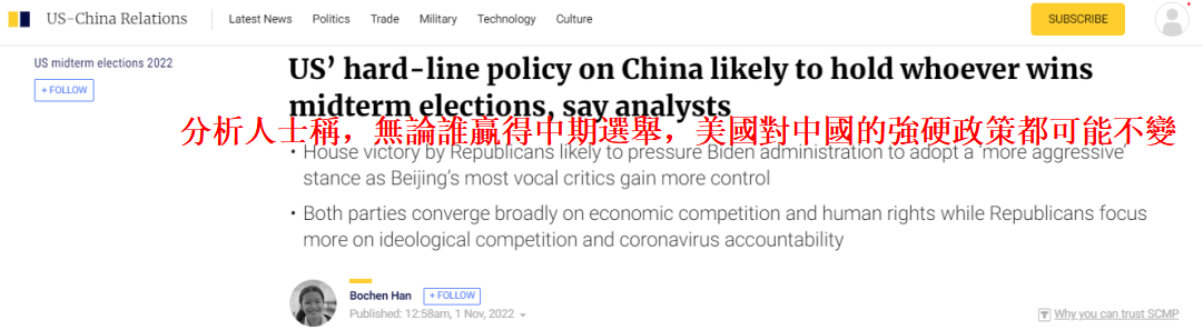 香港《南華早報》報導截圖 近期的民調結果顯示,共和黨可能在選舉中拿下參、眾兩院。而一旦獲勝,共和黨將迫使拜登對華采取更加強硬的態度。 目前,主導對華(強硬)的議員似乎都已鎖定連任。佛羅里達州共和黨參議員馬可·盧比奧有93%的機會連任,盧比奧是長期的中國批評者,至少發起過28項與中國有關的立法。 觀察家認為,這些主要議員的“連任”將加強兩黨對華強硬的“共識”。有學者指出:“中國已成為一個跨黨派的問題,以至於候選人無論其背景和專業知識如何,都在評論它”。 據統計,在拜登宣誓就職前召開的國會會議上,共有400多項與中國有關的法案或決議,它們幾乎都將中國視為“競爭對手”,雖然其中只有少數獲得通過。