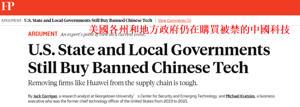 美國《外交政策》報道截圖 文章稱,自2019年來,美國政府機構一直被禁止使用華為、中興和其他三家被認為是“國家安全威脅”的中國公司的設備。美國國家安全部門長期警告稱,這些公司生產的技術可能會被用作“外國間諜活動、黑客攻擊和其他罪惡活動”的渠道。 但是,最近由喬治城大學安全和新興技術中心發佈的一份報告顯示,美國各州和地方政府機構仍在全國的學校、醫院、交通系統、公用事業部門和其他政府設施的網絡中購買和安裝這些公司的“危險設備”。 一份公共采購記錄顯示,2015年至2021年期間,近1700個州和地方機構購買了聯邦政府黑名單上五家中國公司的產品和服務。由於數據不完整,其真實數字可能還要高得多,除了佛蒙特州以外,每個州的政府機構都出現在了購買列表中。