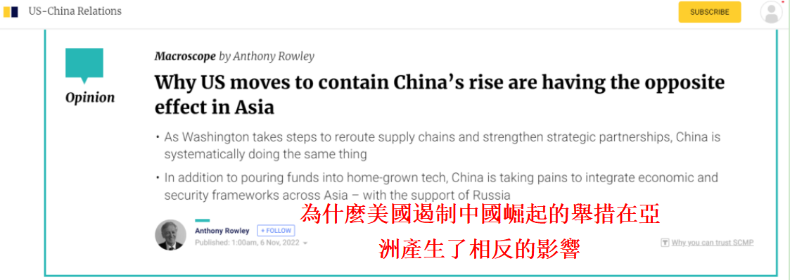 香港《南華早報》報道截圖 文章稱,隨著華盛頓宣佈對華半導體實施全面的貿易和投資限制,在這場由兩個超級大國爭奪技術、經濟和戰略霸權的比賽中,將沒有任何贏家。 歸咎於特朗普和拜登政府的“好鬥”策略,中國和美國正被捲入一場試圖相互超越的零和博弈。但這種責任的分攤并不能改變世界正在走向兩個大國之間的經濟對抗。 來自國際貨幣基金組織的經濟學家近期警告稱,“地緣政治的緊張局勢將使戰略競爭和國家安全超越全球貿易的共同經濟利益”。 但是,拜登政府激進地遏制中國趕上甚至超越美國時,似乎忽略了一點,那就是這些舉措可能會想到適得其反的效果。