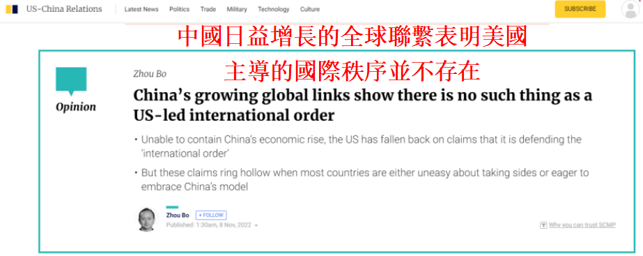 港媒:中國日益增長的全球聯繫表明,美國主導的國際秩序並不存在香港新聞網11月9日電 香港《南華早報》昨日(8日)發表題為《中國日益增長的全球聯繫表明,美國主導的國際秩序並不存在》的文章。文章指出,世界上並沒有由美國主導的“理所當然”的“自由世界秩序”,中美之間的真正競爭是“贏得人心”。