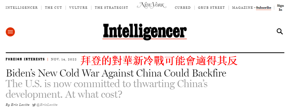 美國《紐約》雜誌報道截圖 文章稱,美國在上個月對中國發動了“經濟戰”。其“敵對宣言”是一份內容複雜的“監管文件”,涉及對半導體、半導體製造設備以及相關美國專業知識的出口限制。這份文件的用意很簡單:如今,阻止中國實現發展目標已正式成為美國的“官方政策”。 然而,如果該政策成功實施,美國政府的出口限制不僅無法阻止中國人工智能產業的發展,反而會促進其發展。從長期來看,拜登的政策反而會加速中國在先進計算領域實現自給自足。 目前,中國每年要進口價值約4000億美元的半導體。如果中國被排除在全球高端芯片市場之外,那麼有很大一部分購買力將轉向中國國內的芯片製造商。