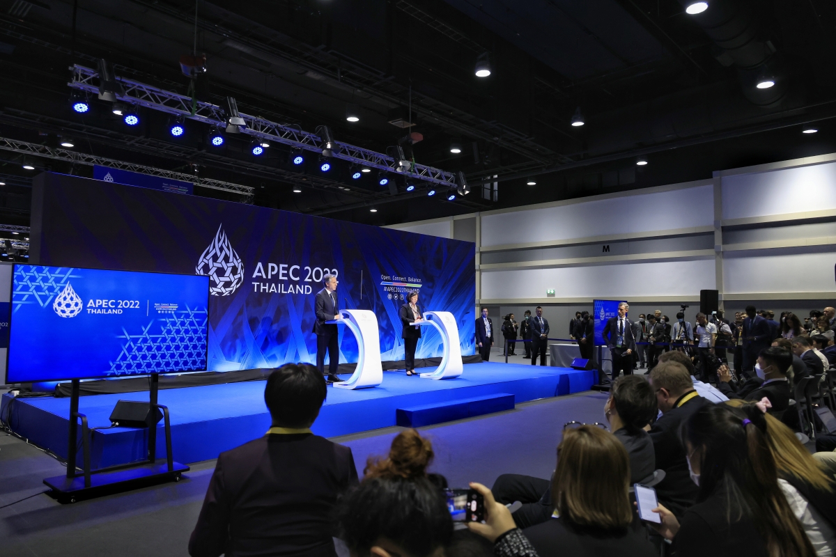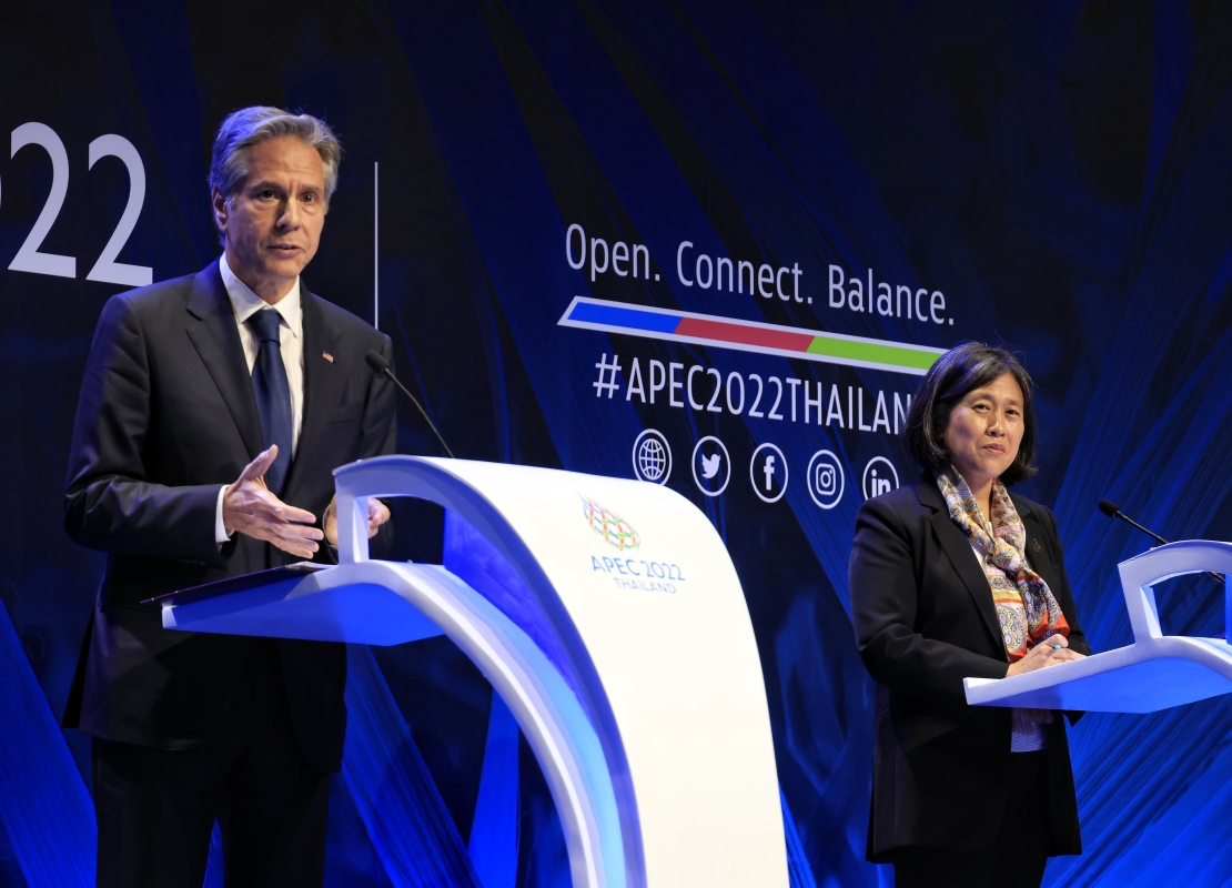 美國國務卿布林肯和美國貿易代表戴琪在會場舉辦了一場記者會。(香港中通社記者 曹文毓 攝) 在美國總統拜登宣佈因私人行程未能出席APEC會議後,《美國之音》引述觀點認為,美國是在把贏得亞太的機會讓給了中國。
