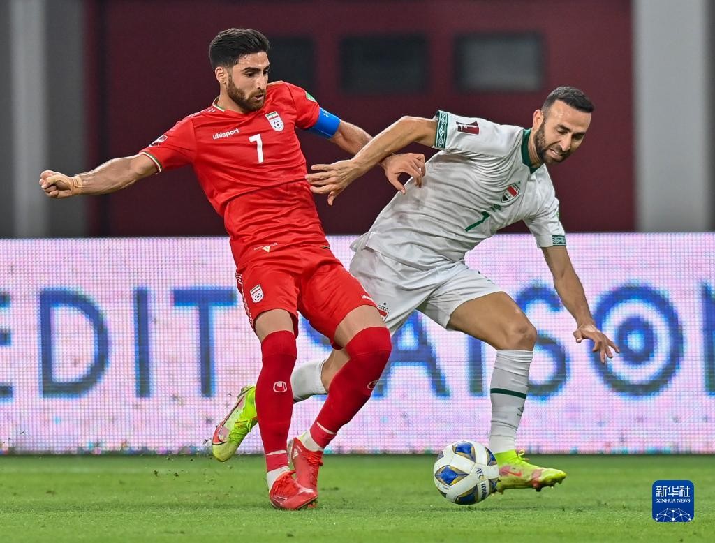 2021年9月7日,伊朗隊球員賈漢巴赫什(左)與伊拉克隊球員梅拉姆在世界盃預選賽中拼搶。圖片來源:新華社(尼庫 攝)