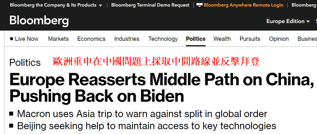 美國彭博社報道截圖 文章稱,今年10月,美國總統拜登要求限制向中國出口半導體和芯片製造設備,以求阻止中國經濟的發展,并要求美國的主要盟友加入該出口限制。此舉引發了人們對全球經濟分裂的擔憂。 上周五(18日),法國總統馬克龍呼籲與北京接觸,并抵制將世界劃分為“相互競爭的集團”。此前,德國總理朔爾茨也發出過類似的呼籲,荷蘭首相呂特也正努力與其他主要的芯片製造國協商以抵制來自美國的壓力。