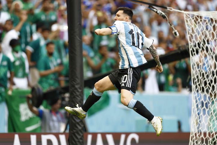 當地時間11月22日,2022卡塔爾世界盃小組賽C組首輪阿根廷(藍)與沙特阿拉伯的比賽在盧賽爾體育場舉行。最終阿根廷隊1:2不敵沙特阿拉伯隊。圖為阿根廷球員梅西慶祝進球。 香港中通社圖片 梅西在開場階段打入一粒點球,但沙特在下半場開局後連入兩球反超比分,這也是亞洲球隊在本屆世界盃上獲得的首場勝利。 第10分鐘,梅西主罰點球騙過阿洛瓦伊斯,左腳推射命中,阿根廷1-0沙特阿拉伯。 這是梅西本屆世界盃的第一粒進球,也是他在歷屆世界盃上的第7個進球,他的世界盃生涯進球數已追平C羅。 下半場開始,沙特迅速組織反擊。第47分鐘,薩赫利·謝赫里接球後突破進入禁區,推射遠角破門,沙特1-1扳平比分。 第52分鐘,達瓦薩里禁區轉身擺脫防守球員後破門,沙特2-1取得領先。 下半場傷停補時8分鐘,全場比賽結束,最終阿根廷1-2被沙特阿拉伯逆轉。 本場比賽,是阿根廷第五次在世界盃上對陣亞洲球隊,此前四次全勝。 梅西是第一位代表阿根廷隊,在四屆世界盃比賽中都有進球的球員。同時,這是梅西的第21場世界盃比賽,追平了馬拉多納,成為代表阿根廷出戰世界盃場次最多的球員。 梅西也是繼貝利、烏韋·西勒、克洛澤和C羅之後,第五位在四屆不同的世界盃比賽(2006年、2014年、2018 年、2022年)中進球的球員。(完) 【編輯:胡雪石】
